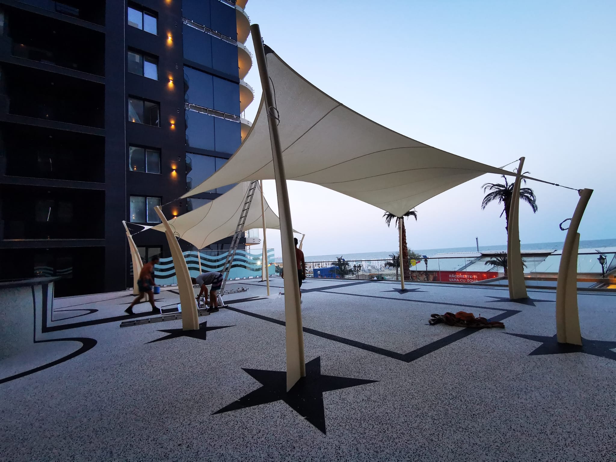 Fiecare proiect din portofoliul nostru a început cu o problemă de inginerie — o geometrie de rezolvat, un amplasament de înțeles, o structură de descoperit. Ce vedeți mai jos este rezultatul acestui proces: structuri din membrane tensionate proiectate prin form-finding, fabricate în propriul nostru atelier și instalate în toată România.