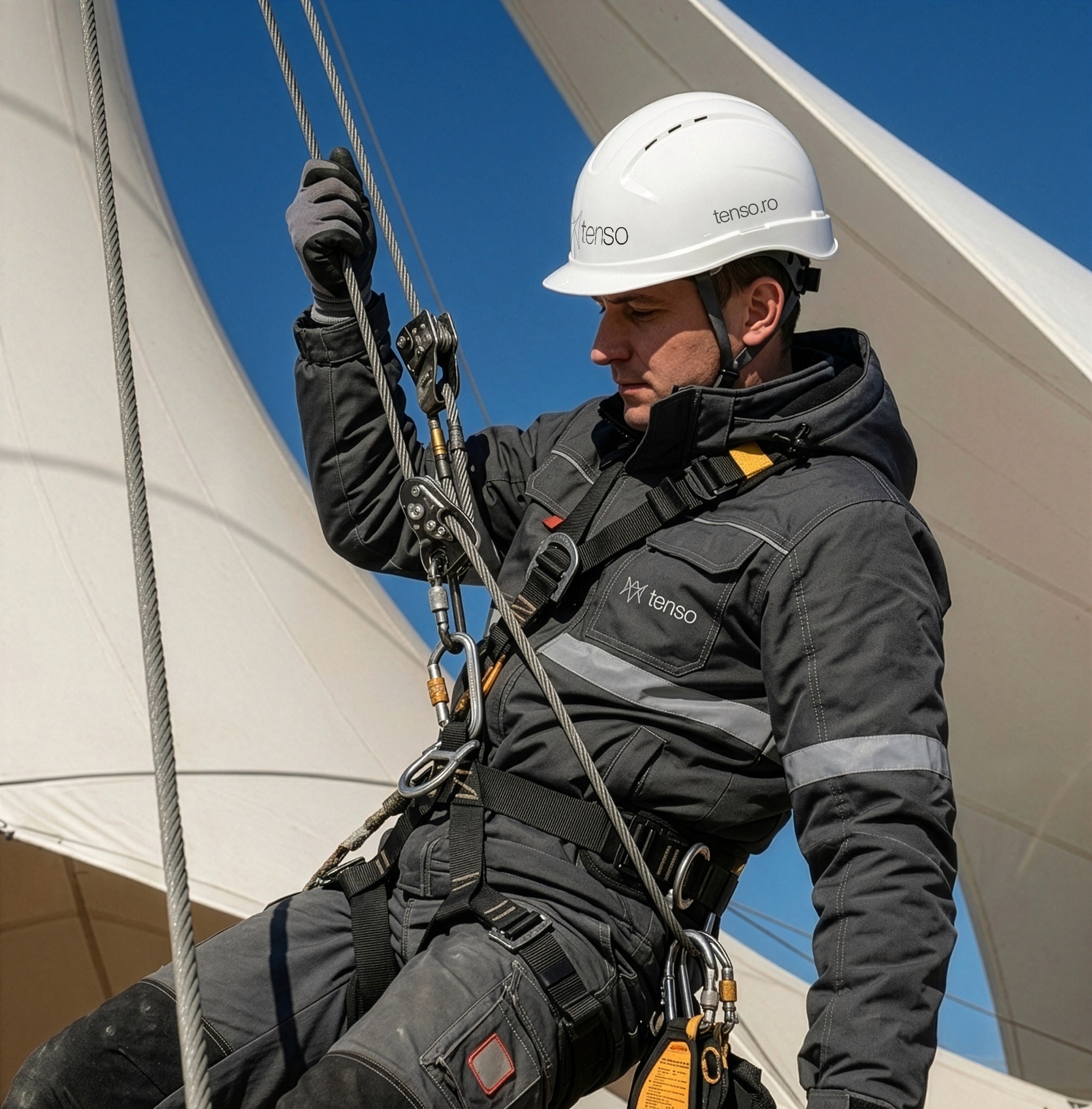 Instalare realizată de echipe cu experiență în structuri cu membrane tensionate, dotate cu echipamente de ridicat corespunzătoare, unelte de tensionare, instrumente topografice și de monitorizare specializate.