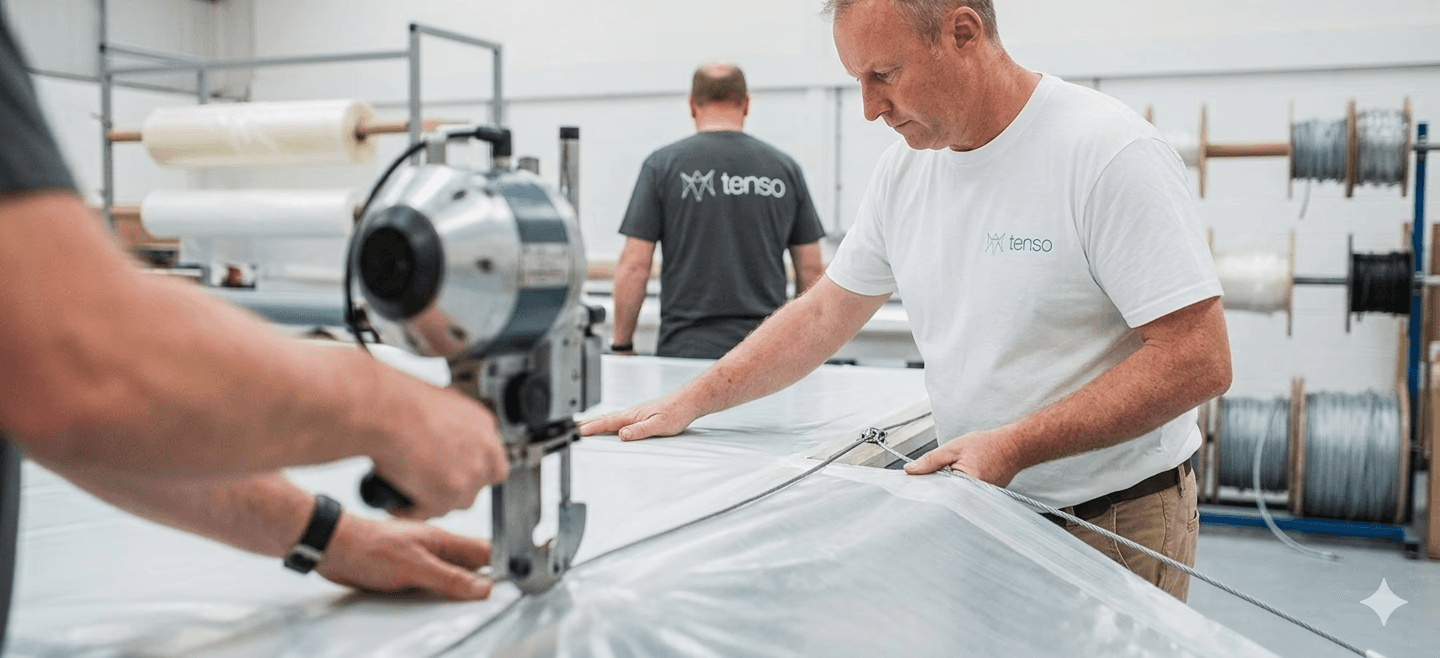 Fabricarea de precizie asigură că structurile performează conform proiectării. Debitarea manuală poate da naștere unor erori cumulative: panouri care nu se potrivesc, tensiune distribuită neuniform, cusături aflate în zone de concentrare a eforturilor care nu au existat în model. Debitarea automatizată (CNC) elimină aceste riscuri. Sudura de înaltă frecvență creează îmbinări permanente mai rezistente decât materialul de bază. Pre-asamblarea în atelier identifică eventualele defecte înainte ca orice componentă să ajungă pe șantier, prevenind astfel întârzieri și corecții pe teren unde totul devine mult mai costisitor.